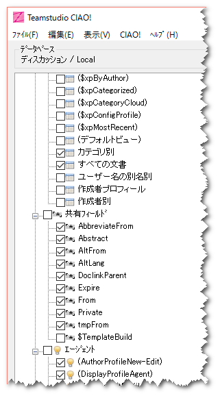 [CIAO!] ウィンドウに、開いているデータベースの名前、設計要素、各要素を チェックアウトしたユーザーが表示されます。